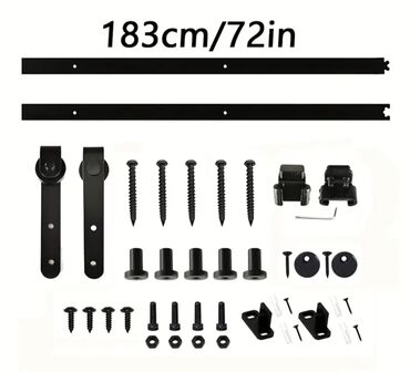 - Kompletan hardver za jedna klizna vrata: dve čelične šine ukupne dužine 183 cm, 2 nosača/klinasta valjka, odstojnici, graničnici, podni vodič, zaštitne kapice, šrafovi i tiplovi.