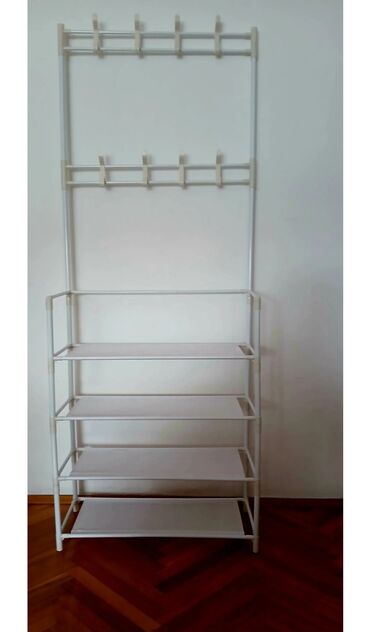 - Materijal: metalna konstrukcija sa plastičnim spojnicama i kukama; police od platna/sintetičke tkanine zategnute na ramovima