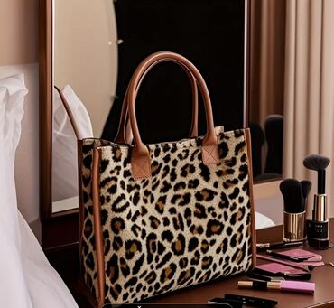 - Dizajn: šik leopard print u nijansama bež, smeđe i crne, sa glatkim karamel kožnim/eko-kožnim ivicama i ručkama