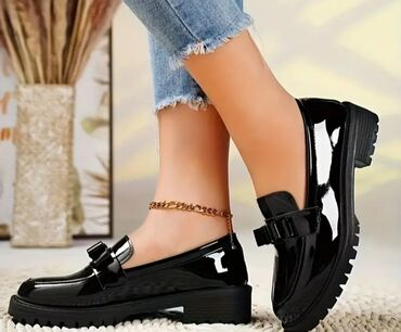 Crne ženske mokasine – lakovana koža, klasičan penny dizajn. - Brend/oznaka: Comfort (natpis na ulošku) - Veličina: 39 (otisnuto sa strane) - Materijal gornjišta: sjajni lak (lakovana završna...1 600 RSD