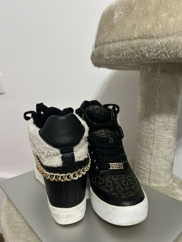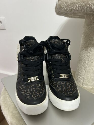 - Ukrasni zlatni detalji: metalne pločice „GUESS“ na pertlama, zlatni „G“ i masivni lanac oko pete