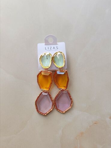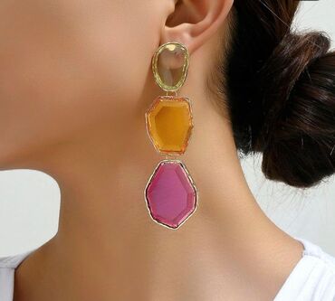 Drugi materijalOve ženske viseće minđuše karakteriše nizanje geometrijskih kamenčića u različitim bojama, stvarajući upečatljiv izgled. Svaka minđuša ima tri segmenta: gornji svetlozeleni, srednji narandžasti i donji ružičasti. Kamenčići su nepravilnog, fasetiranog oblika i obrubljeni su zlatnim metalom, što im daje sofisticiranu notu. Dizajn je moderan i privlačan, idealan za dodavanje boje i stila svakoj odevnoj kombinaciji, bilo za svakodnevno nošenje ili posebne prilike.