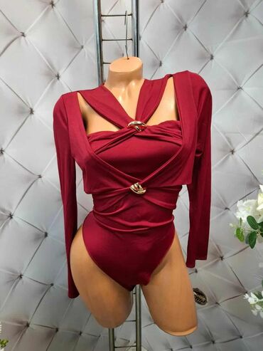 Plišan/čipkani bodi u boji bordo vina. Gornji deo je od providnog tila, dok je prednji panel od mekanog pliša. Dubok V izrez sa dekorativnim metalnim alkama i satenskim trakama za vezivanje. Leđa o...