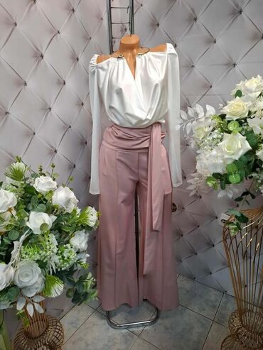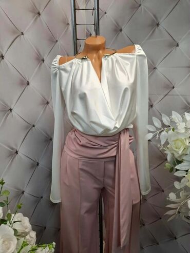 Elegantni ženski komplet – bluza i pantalone širokih nogavica - Dizajn: Asimetrična bluza sa dugim rukavima i drapiranim preklopom u struku koji vizuelno sužava figuru; diskretno naglašena ramena....