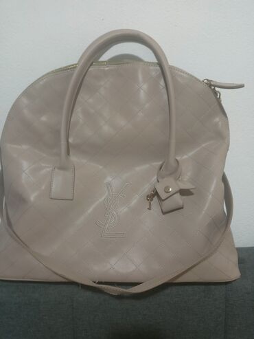 - Torba u bež/nuance pudera, prošiveni „kvadrat” dezen. Veći polukružni oblik sa dvema ručkama i dodatnim dugim kaišem za nošenje preko ramena. Metalni detalji zlatne boje, gornji rajsferšlus, dekorativni privesak sa malim ključem. Na prednjoj strani velik, ušiven monogram „YSL”. Prostrana unutrašnjost pogodna za svakodnevnu upotrebu.