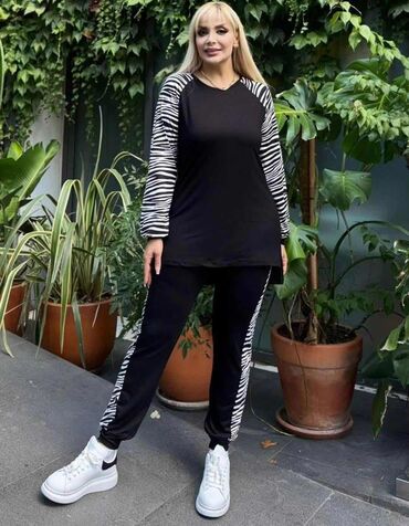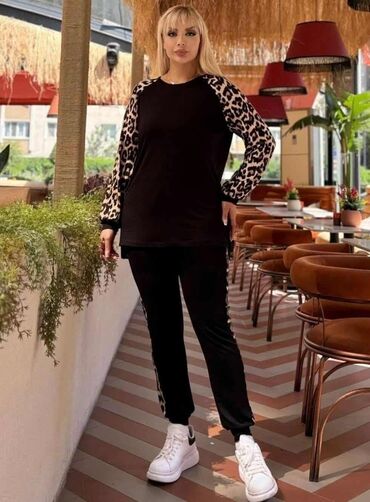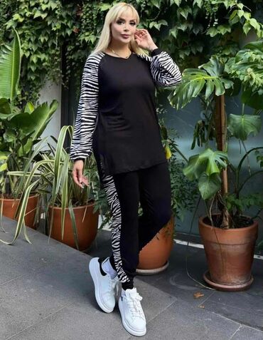 - Donji dio: uske trenerke sa elastičnim pojasom i zategnutim rubom na nogavicama; bočne trake u istom printu kao rukavi (leopard ili zebra) vizuelno izdužuju noge.