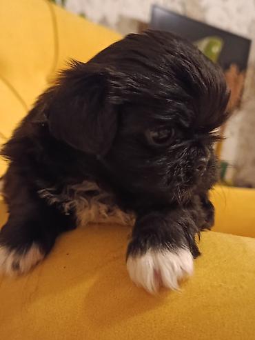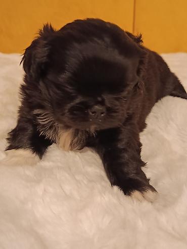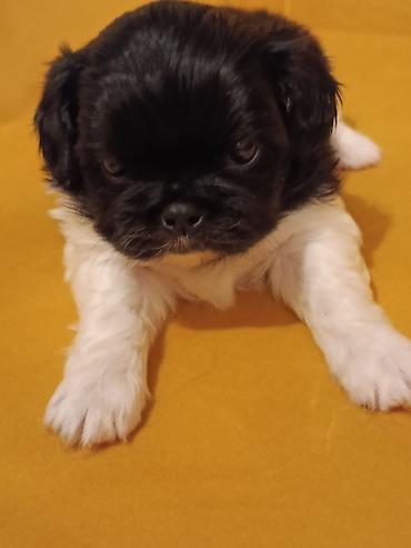 Štene malog rasta – crno-belo, dugodlako - Preslatko štene kompaktne građe, kratkih nogu i okrugle glave. - Boja: belo telo sa crnim oznakama; crna maska oko očiju i ušiju. - Dlaka gusta i talasas...
