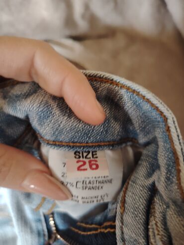 JednobojniTraper mini suknja sa svetlim pranjem i blagim “worn” efektom. Klasican pet-džep kroj sa šlicevima za kaiš i metalnim dugmetom/rajferšlusom napred. Dekorativni štepovi i sitni metalni nitni/šljokice oko džepova i pri donjem rubu. Brend: Pagame (oznaka na džepu). Veličina: 26. Materijal: pamuk sa elastanom (sadrži spandex za elastičnost). Praktična i udobna, lako se kombinuje uz patike ili sandale.