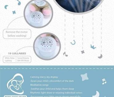 Postoje 3 zvuka bele buke i 10 umirujucih uspavanki. Pritisnite dugme za reprodukciju 3 zvuka bele buke: nezni opustajuci zvukovi prirode, mamino srce, zvuk ptica i zvuk tekuce vode. Smirujuce uspavanke prate ocaravajuca rotirajuca svetla galaksije i pruzaju atmosferu iz snova za spavanje.