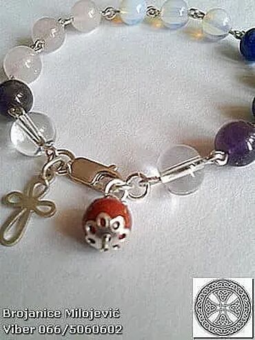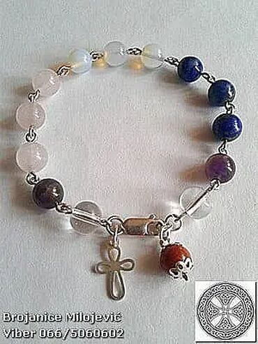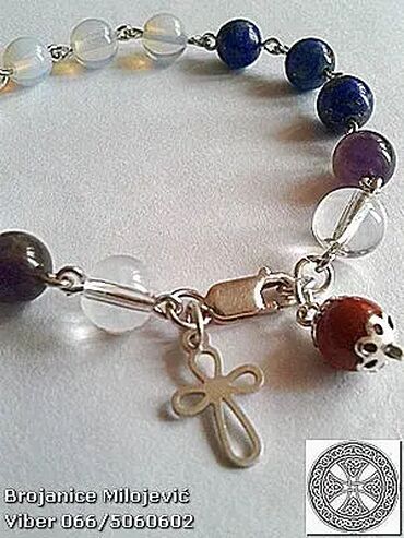 Brojanica je ručni unikatni rad napravljena od poludragog kamena u kombinaciji gorski kristal, ametits, lapis lazuli i sunčev kamen. Brojanica je urađena na srebrnim osnovama sa krstićem od srebra i kopčom od srebra. Dužina u obimu je 16 cm.