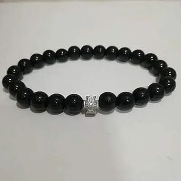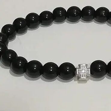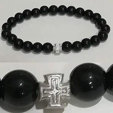 Brojanica od oniksa srebro 925 je ručni rad napravljena od poludragog kamena oniksa u poliranoj varijanti, prečnika perli 8 mm i krstića od srebra. Krst od srebra je težine 1.50 grama. Oniks daje snagu i pruža podršku u teškim i zbunjujućim okolnostima i u periodima velikog mentalnog ili fizičkog stresa. Ovaj kamen podstiče krepkost, postojanost i izdržljivost. Potpomaže u učenje, daje samopouzdanje i pomaže nam da se opustimo u svom okruženju. Oniks je kristal koji je simbol koncentracije i pokornosti. Veruje se da nas oslobađa od dugova karme i vodi na putu do istine, duhovne mudrosti te duhovnog oslobođenja. Pomaže u razvoju samokontrole, duhovne zrelosti, prizemljenju i kontrolisanju nepoželjne energije. Za oniks se kaže da sadrzi sećanja na stvari koje su se dogodile nosiocu pa može da se koristi u psihometriji, da “ispriča priču” onima koji su osetljivi na njegove vibracije. Oniks se takođe koristi da izleči stare jade i žalosti. Fizički, oniks pomaže apsorbciju energije iz univerzuma koje se mogu koristiti u različite svrhe. Dovodi u ravnotežu jin i jang energije unutar tela.Za lečenje, oniks se preventivno koristi kod bolesti sluha, za otklanjanjanje neprijatnih šumova, kod poremećaja ravnoteže te za izoštravanje vida. Pojačava imunitet, pozitivno deluje na kožne bolesti kao što su gljivice, upale, opekotine, gnojne rane i osip. Koristan je za zube, kosti, koštanu moždinu, krv i stopala. Pomaže rastu kose, jača nokte, poboljšava krvotok, a posebno je koristan onima koji pate od hladnih ruku ili nogu.