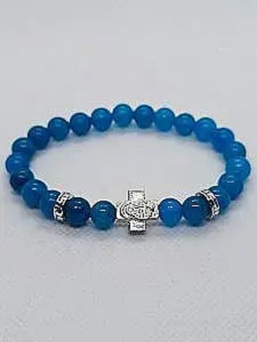 Narukvica sa priveskomBrojanica za ruku od plavog žada srebro 925 je ručni rad, napravljena od perli plavog žada veličine 8 mm sa ukrasnim srebrnim dodacima razdelnika i srebrnog krstića. Srebrni krst je 3,7 grama težine. Brojanica je 20 cm dužine obima.