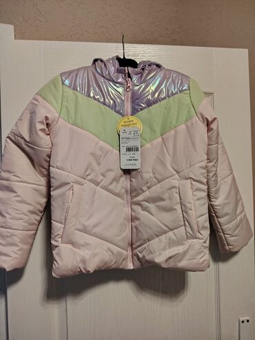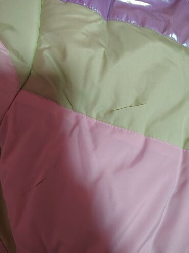Dečija zimska jakna LC Waikiki Jakna sa malim oštećenjem - Model: kratka, prošivena jakna sa kapuljačom - Boje: svetloružičasta osnova sa pastelno‑zelenim umetkom i gornjim sjajnim, iridescentnim...