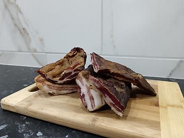 Svinjski komadi pažljivo usoljeni, prirodno osušeni i dimljeni na hladnom dimu za pun, izražen ukus.