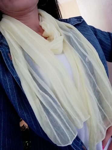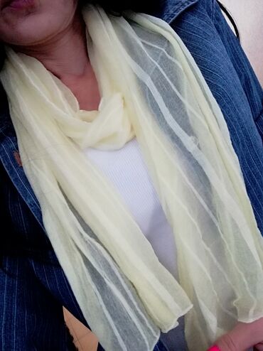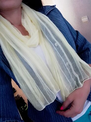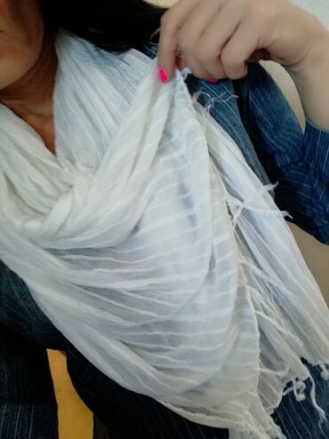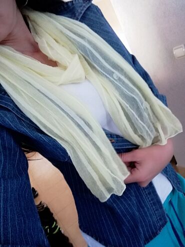 Marama kvadratnog oblika, dimenzije 72 x 72 cm. Tirkizna osnova sa štampanim cvetnim motivima u ružičastoj, ljubičastoj i plavoj, uz tanke vertikalne pruge u pastelnim tonovima. Lagan, providan mat...