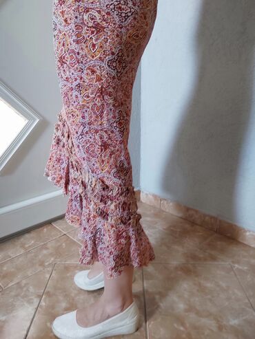 Ženska suknja A-kroja sa upečatljivim cvetnim printom. - Model: visoki struk, nabrani deo na pojasu koji daje punoću i blagi “skater” izgled - Dužina: do kolena (approx. midi/kratka iznad kolena) ...