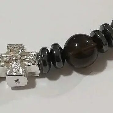 Materijali : Perle čađavog kvarca (8 mm), diskovi hematita i srebrni krst 925.