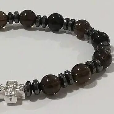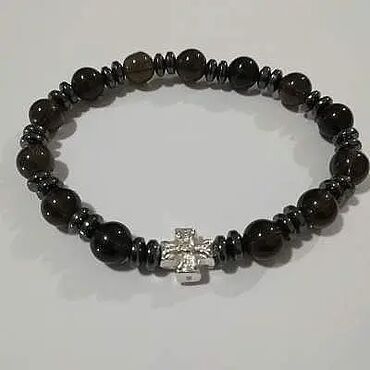 Otkrijte moć prirode i duhovnosti uz ručno izrađenu brojanicu od čađavog kvarca i srebra 925. Ova prefinjena narukvica kombinuje poludragi kamen čađavog kvarca (8 mm perle) i diskove hematita sa elegantnim srebrnim krstom kvaliteta 925, stvarajući jedinstveni komad nakita koji spaja lepotu i duhovnu snagu.