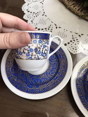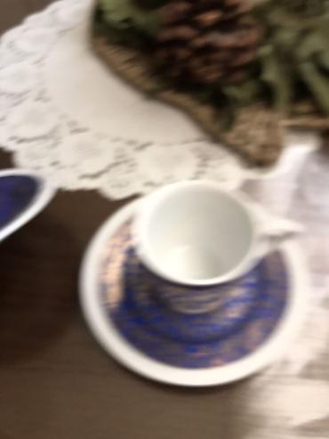 - Dekor: kobaltno plava podloga sa bogatim zlatnim ornamentima i sitnim cvetnim motivima oko celog oboda šoljice i tacne