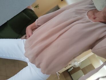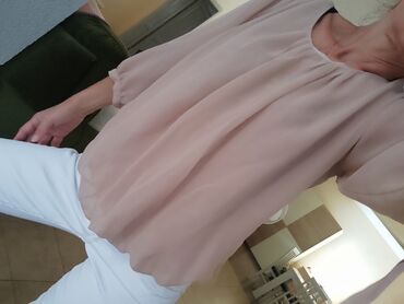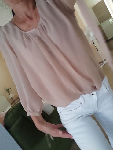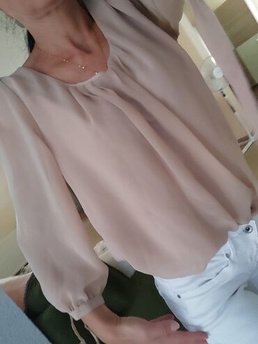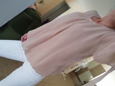 H&M ženska košulja na pruge - Veličina: M - Dužina: 55 cm - Poluobim: 42–52 cm (rastegljivo) - Plavo‑bele uske pruge - Kratki rukavi sa naborom i dugmić detaljem - Klasičan kragnu, V-izrez sa nabor...