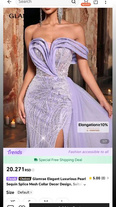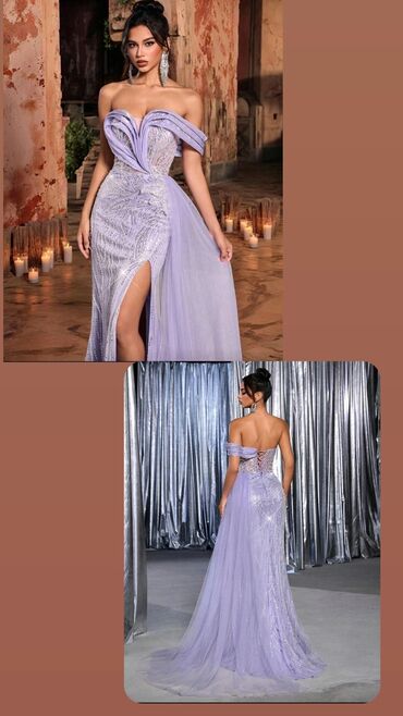 Luksuzna večernja haljina u boji lavande sa bogatim šljokicama i perlama. Model bez naramenica sa spuštenim ramenima i dramatičnim preklopima na korsetu koji formiraju efektnu 3D dekoraciju. Poluprovidan mrežasti korset sa vezanjem na leđima (korzet-lacing) omogućava prilagođavanje struku. Suknja je uska uz telo sa visokim šlicem napred, prelazi u dugačak šlep od laganog tila za eleganciju pri hodu. Dekorativni uzorci od šljokica raspoređeni su duž cele haljine, daju sjaj i ističu siluetu. Elastičnost materijala ≥10% za udobnije pristajanje.