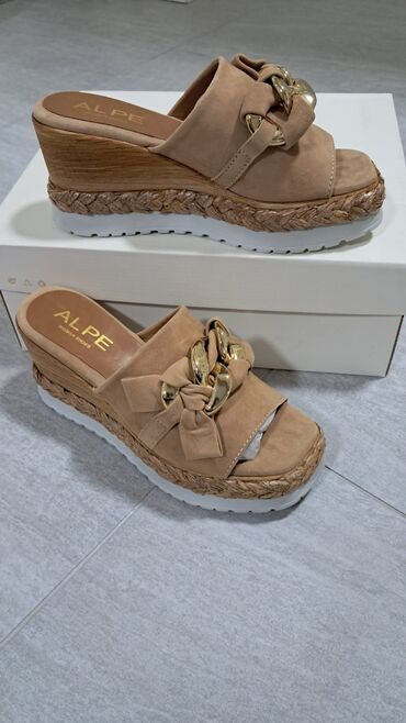 ALPE ženske klompe/sandale na platformu - Veličina: 38 (naznačeno na kutiji) - Boja: topla kamel/konjak - Gornjište: mekana brušena koža sa ukrasnom mašnom i krupnim zlatnim lancem - Đon: bela gum...