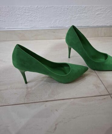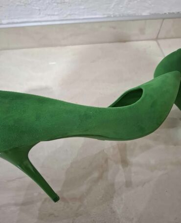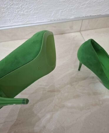 Napomena: U poslednjoj fotografiji se vidi drugačiji model obuće (cipele sa pertlama i kariranom postavom), ali predmet oglasa su zelene salonke prikazane na prva tri/fotografije.