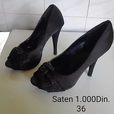 3) Saten, peep-toe model sa ukrasnom mašnom i sitnim kamenčićima, visoka potpetica. Broj: 36. Cena: 1.000 din.