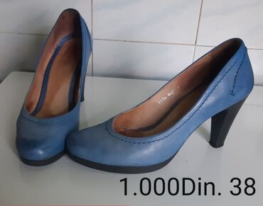 - Plave salonke sa visokijom štiklom i blagom platformom napred; zaobljen vrh, dekorativni šavovi. Veličina: 38. Cena: 1.000 din.