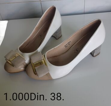 - Bele salonke sa ukrasnom mašnom i zlatnim detaljem na kapici u bež tonu; srednja blok potpetica sa prugastom teksturom. Veličina: 38. Cena: 1.000 din.