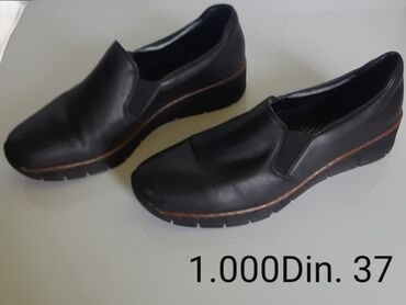 - Crne slip-on cipele na blagoj platformi/klin potpetici; elastične umetke sa strane za lako obuvanje, gumeni đon sa profilom. Veličina: 37. Cena: 1.000 din.