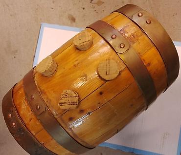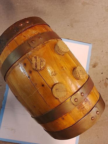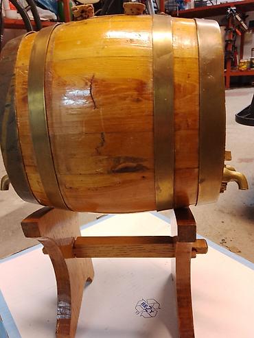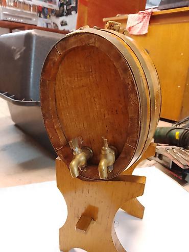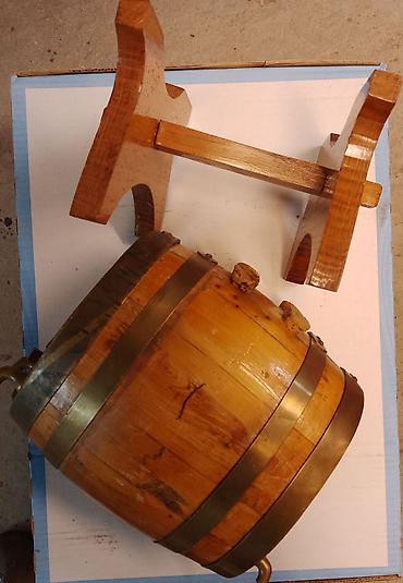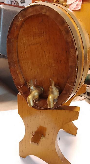 Napomena: drvena bačvica sa bakarnim obručima i četvorostrukim slavinama, sa plutanim čepovima i postoljem, spremna za točenje omiljenih pića.