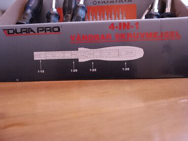 Model/oznaka na pakovanju: Vändbar skruvmejsel, 4‑IN‑1, DURAPRO. Kompletu pripadaju gore navedene T‑bit veličine integrisane u telu alata.
