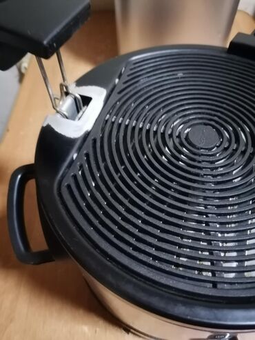 - Okrugla friteza sa metalnim telom i plastičnim poklopcem sa spiralnim otvorima za paru