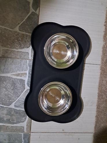 - Dvostruke metalne činije na podlozi u obliku kosti. Dve nerđajuće činije koje se vade radi pranja, gumirana/silikonska podloga sprečava klizanje i hvata prosutu vodu i hranu.