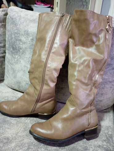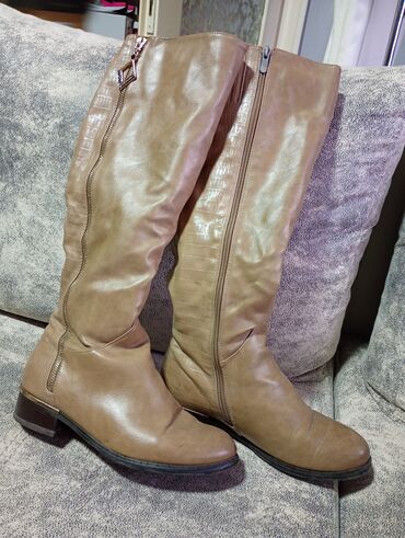 Ženske kožne čizme do kolena u bež/karamel boji.