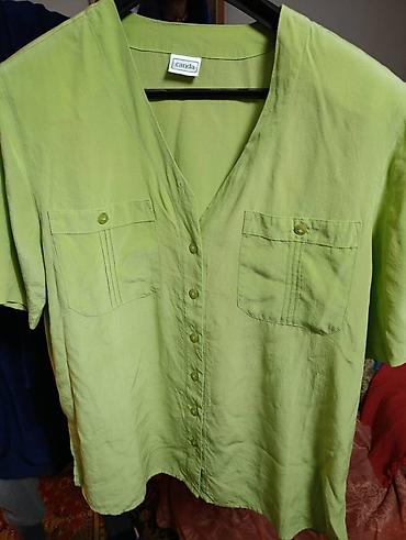 2) Svetlozelena košulja Canda svetlozelene, limeta boje, sa V-izrezom, kratkim rukavima i ravnijim, opuštenijim krojem. Dva našivena džepa na grudima sa dugmićima. Broj 42.