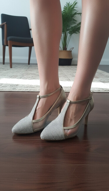 Elegantne ženske baletanke/sandalete u zlatno‑srebrnoj boji sa špicastim vrhom. Gornjište ukrašeno gusto postavljenim sjajnim kamenčićima koji prelamaju svetlost. Bočne strane od prozračne mrežice sa zlatnim obrubom. T‑kaiš dizajn preko risa sa tankom trakom oko zgloba i kopčanjem sa strane. Unutrašnjost i uložak sjajni zlatni, za svečani izgled. Ravni đon od gume sa diskretnom petom i protivkliznim šarom. Idealne za svečane prilike, mature, venčanja ili večernje izlaske.