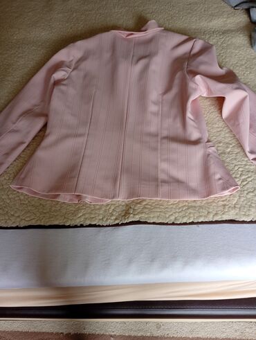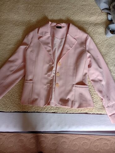 Elegantni ženski sako u nežno roze boji sa diskretnim vertikalnim prugama.