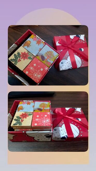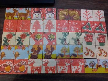 - Set kvadratića od drveta sa raznobojnim, prazničnim motivima: irvasi, Sneško Belić, zvona, jelke, pahulje, božićna zvezda (poinsettia), zimzelen, rukavice, bombone-štapići, narandže, sove, ježevi, zvezdice i drvo u jesenjim bojama.