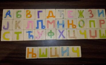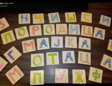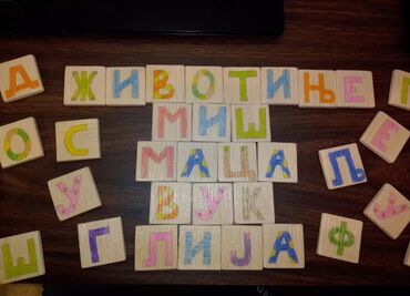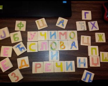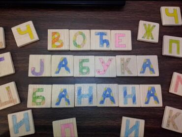 - Set ručno rađenih drvenih pločica sa svim slovima srpske ćirilice, uključujući posebna slova (Љ, Њ, Ђ, Ћ, Џ).