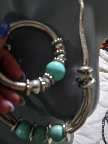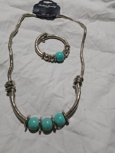 - Detalji: ukrasne distancere i perle u srebrnoj boji; naglašene velike tirkizne perle (3 na ogrlici, 1 na narukvici) sa blagim šarama