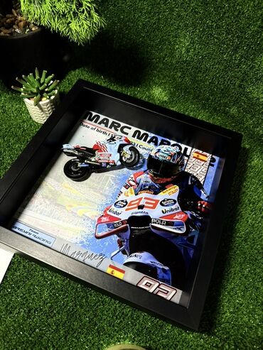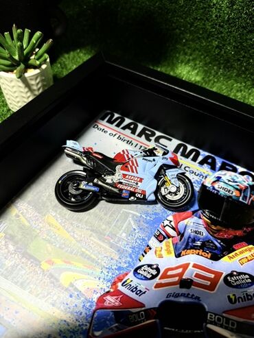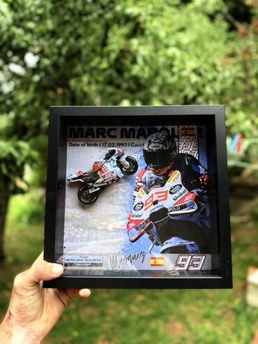 ŠarenoUramljeni 3D prikaz sa motivima Marka Markeza, poznatog motocikliste. Centralni deo čini trodimenzionalna minijatura motocikla, upotpunjena detaljnom slikom Markeza u trkačkoj opremi. Ispod slike se nalazi verodostojan potpis i broj 93, koji je karakterističan za ovog vozača. Ram je dubok, sa zaštitnim staklom, idealan za izlaganje na polici ili kačenje na zid, savršen za ljubitelje Moto GP trka.