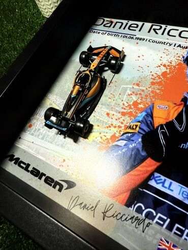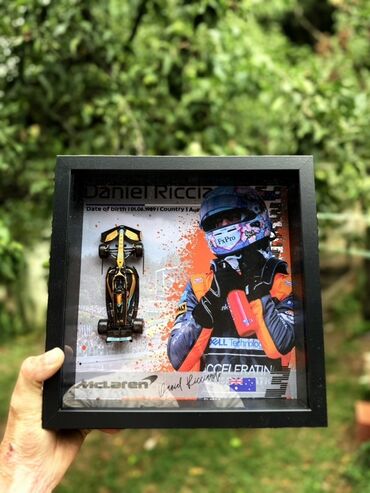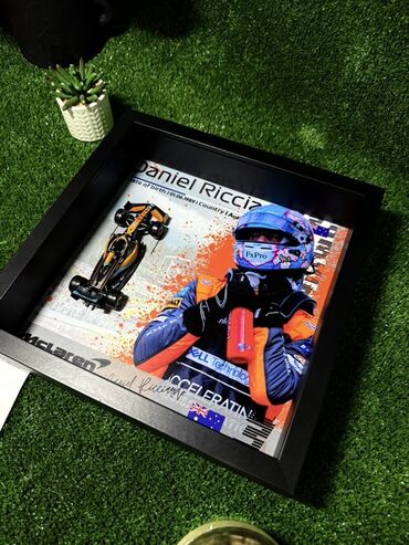 Uramljena umetnička slika posvećena Danielu Ricciardu, poznatom vozaču Formule 1. Slika prikazuje ilustraciju Daniela Ricciarda u trkačkoj opremi, uz minijaturni model McLaren bolida. U donjem levom uglu slike nalazi se logotip "McLaren", dok je u donjem desnom uglu prikazana zastava Australije. Slika je uokvirena crnim ramom, što joj daje elegantan izgled i naglašava sadržaj. Idealna je za ljubitelje Formule 1, kolekcionare, ili kao dekoracija za prostorije sa sportskom tematikom.