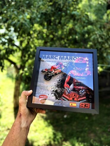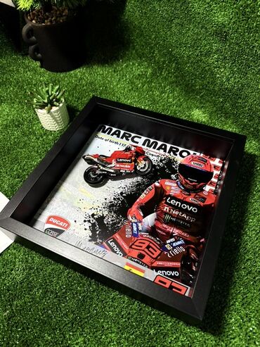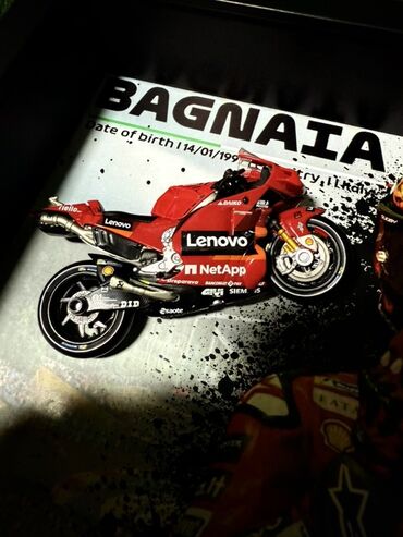 Predstavljen je uramljeni izložbeni predmet sa minijaturnim motociklom Ducati. Okvir je crne boje i sadrži ilustraciju vozača u trkačkom odelu i motocikla. Idealan je za kolekcionare moto sporta ili kao dekorativni element u sobi, kancelariji ili garaži. Dizajn uključuje logotipe sponzora, što doprinosi autentičnosti i detaljnosti.