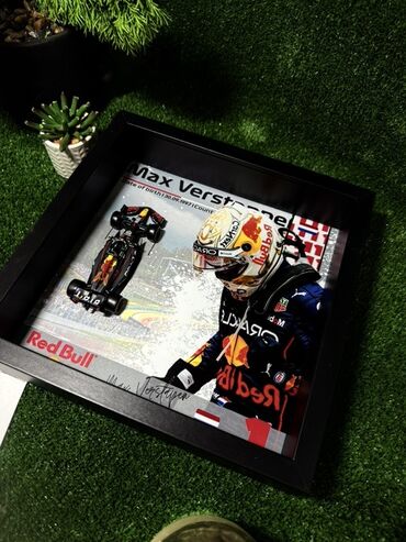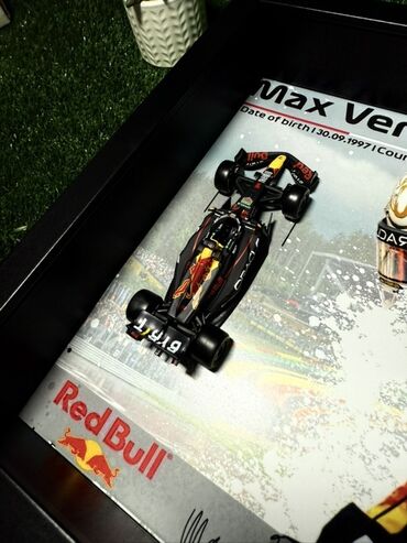Uramljeni kolekcionarski predmet posvećen Maxu Verstappenu i Red Bull Racing timu. Sadrži sliku Maxa Verstappena u trkačkoj opremi, umanjeni model trkačkog automobila Formule 1 i potpis vozača. Red Bull logo je jasno istaknut. Idealno za ljubitelje Formule 1 i kolekcionare. Predmet je opremljen crnim ramom koji se može okačiti ili postaviti na ravnu površinu. Dizajniran je za izlaganje u domovima, kancelarijama ili kolekcionarskim prostorima.