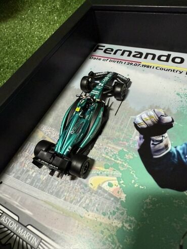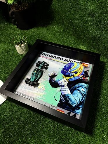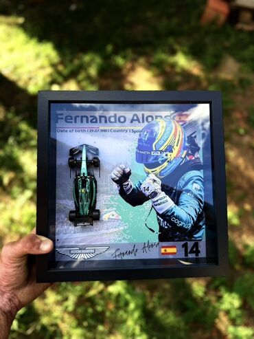 Predstavljamo uramljenu umetničku sliku sa temom Formule 1, posvećenu poznatom vozaču Fernandu Alonsu. Ovaj komad sadrži detaljan prikaz bolida Aston Martin F1 i Alonsa u njegovom trkačkom odelu sa kacigom. Dimenzije okvira su približno 25,5 cm x 25,5 cm. Idealan je za ljubitelje Formule 1, kolekcionare automobilskih suvenira ili kao dekorativni element za dom ili kancelariju. Sastoji se od štampanog postera sa istaknutim 3D modelom bolida F1, smeštenog u duboki crni ram. Detalji o Alonsu, uključujući njegovo ime, datum rođenja i nacionalnost, diskretno su prikazani na pozadini. Ovaj predmet je vizuelno privlačan i predstavlja posvetu jednom od legendarnih vozača Formule 1.