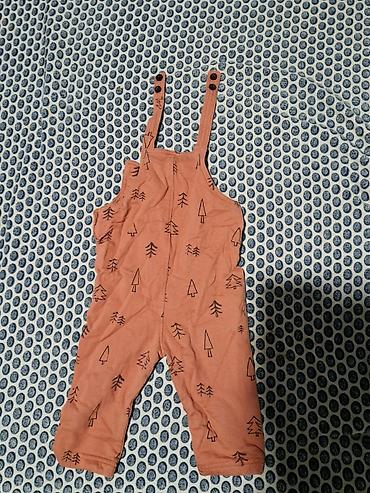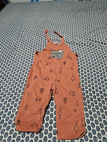 2) Tregerice/pantalonice od tankog pamučnog dresa u boji terakote, sa crnim printom stilizovanih jelki po celoj površini. Podesive tregere sa po dva dugmeta za kopčanje. Ravne nogavice, udobne za svakodnevno nošenje.