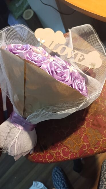 - Ručno rađeni buketi od satenskih ruža, pažljivo aranžirani u papiru i dekorativnoj mrežici.