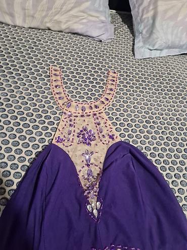 - Detalji: bogata aplikacija ljubičastih i bisernih kamenčića/perlica na dekolteu i preko pojasa; ukrasni prozirni pojas sa vezom i perlicama